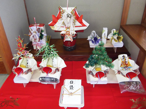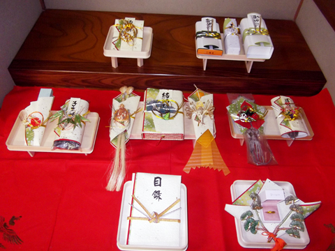 金振檀紙を始め、白本檀紙・黄金振檀紙・桃金振檀紙・友禅和紙などで結納品を丁寧に作成しております。床間に美しく豪華です。